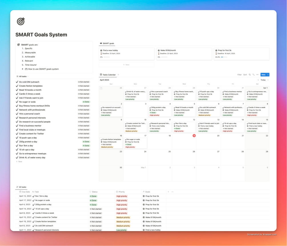 Revolutionize your goal-setting with our Notion-based system, tailored to the SMART framework for effective tracking and execution. Join 700+ satisfied users and embrace efficiency with the proven SMART method!